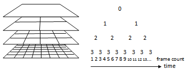 So on frame 1 you update layer 3 based on its siblings and its parent(s). Since there is no layer below you can treat the layer below as being zeros, just as we do for the neighbours outside of the edges of the grid. On the next frame, update layer 2, then the next frame update layer 3 and so on.