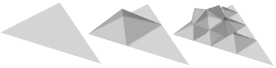 Here it is, we replace each triangle with 6 smaller triangles of the same shape, with 4 of these forming a diamond based pyramid. Using the pyramid as the base, we parametise the bend angle by choosing the height of the pyramid for unit length base edges. Here are the first three iterations: