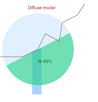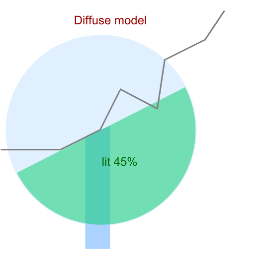 The first reflection model I call the diffuse model. Each vertex of the curve calculates the proportion of sky that is visible from its position, looking only to one side of the curve. It therefore models the reflection as going in all directions (as though from a point).