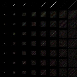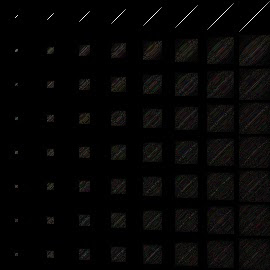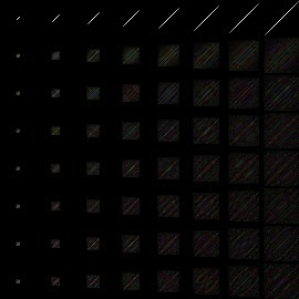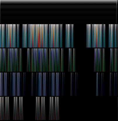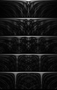 Unlike Jos Stam's work above, we cannot assume the integration is extended over the full curve as the curve varies everywhere. Instead we have to choose a finite width curve for the interference to act on. This finite size equates to the fact that our eyes can only resolve to a certain resolution (depending on the lens size), and features on the fractal under this 'coherence width' interfere. But this width is an extra parameter. The reflection off a Koch curve therefore has four pertinent parameters, which I map out in the image below. The first two (small coords below) are view angle (y) and incident angle (x). The third coordinate (the 8 rows) is the dimension of the curve, below it varies from 1 (top) to 1.2 (bottom). Notice that the top row is a line along view angle = -incident angle in other words pure reflection of the incoming light.