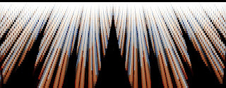 Because the Koch curve is built from subdivisions that flip direction each iteration, the shape difference at half the wavelength is is either concave or convex depending on the iteration, or equivalently the physical size of the curve. As such, and consistent with the results above, the Koch curve is either brown tinted when the difference is concave, or blue tinted when it is convex. Below I have shown the curve as viewed from above against dimension from 1 to 2 for both 9 (top) and 10 iterations, the double-resolution 10-iteration image is rescaled horizontally, so is the one with half height.