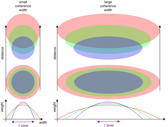 Since we can't limit to integer view angles, we choose a different means to avoid colour biasing due to the finite coherent width (which we make about 2 pixel widths), firstly we weight the light contributions to ramp down at both sides of the light beam (a parabola, see bottom of figure below), secondly we make the higher wavelength light have a proportionally higher coherence width, as shown in the figure below.