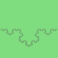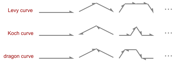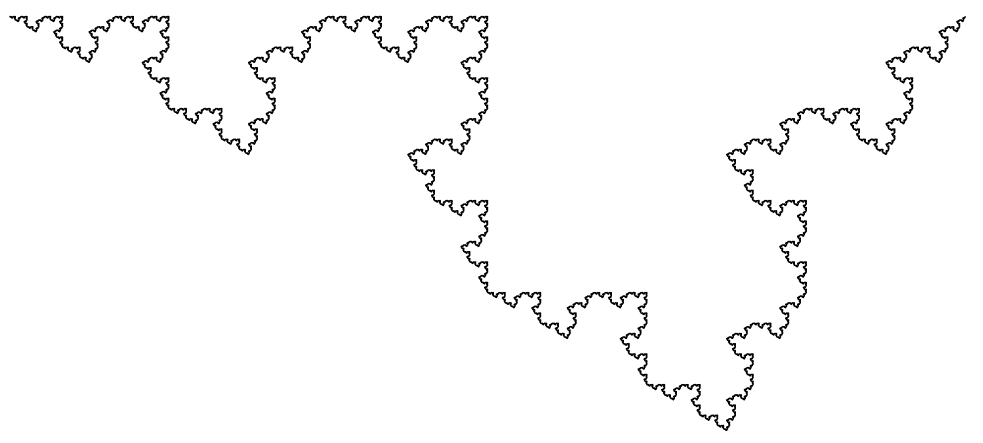 What doesn't seem to have been described before is that there are three other fractal curves from this basic construction. In fact, since an oriented line segment can be rotated 180 degrees, reflected around its length, or both, there are four options per child line, so 16 possible fractal curves. However many just give reflected or rotated versions of the same curve, leaving just six unique fractal curves. The remaining three curves look like this, for bend angle 30, 60 and 90 degrees: