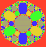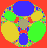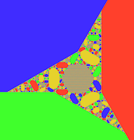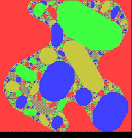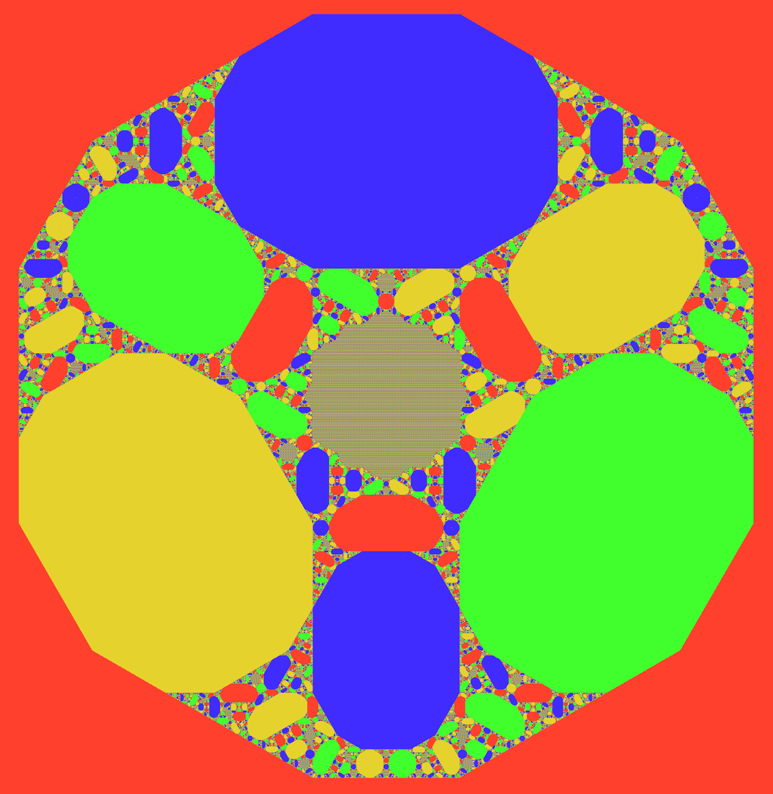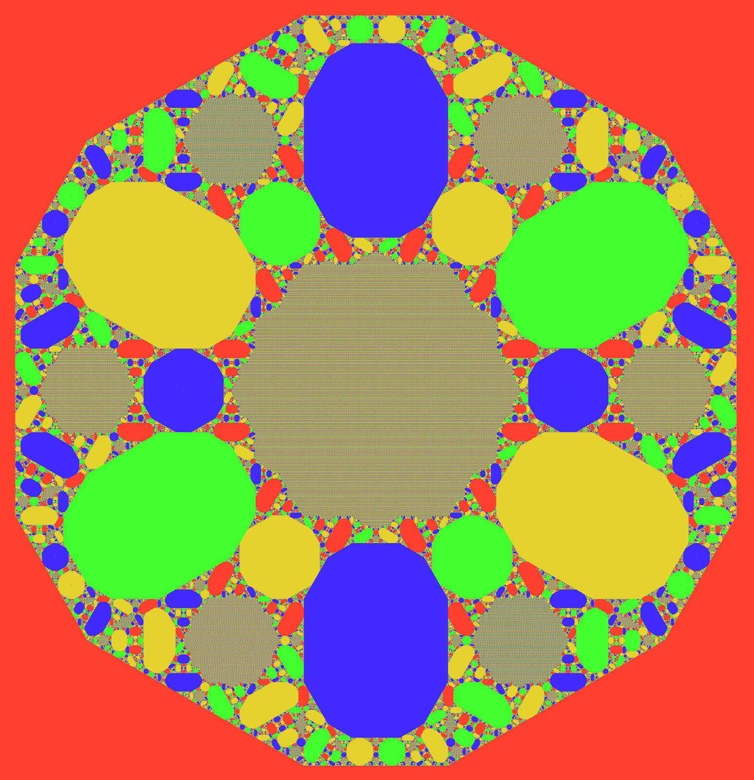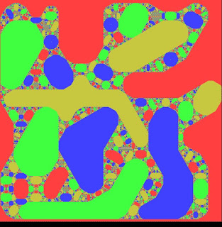 The apparent fifth colour is a nowhere-dense mix of the four colours and primarily takes the shape of a modified Koch snowflake, by contrast the dense colours are all finite sided polygons.