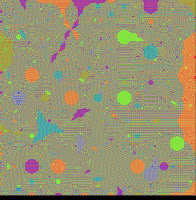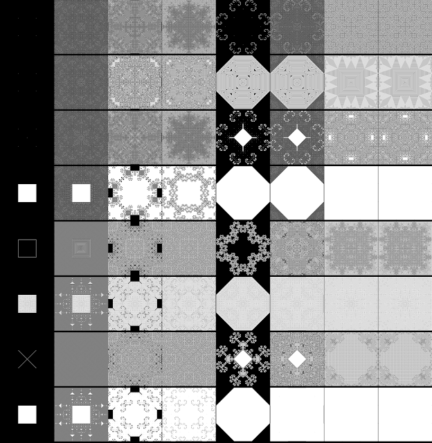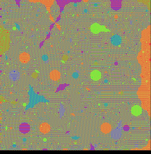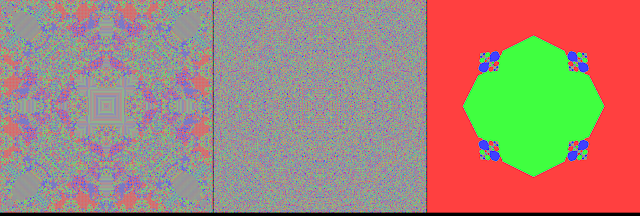 A tweet by someone called R4_Unit showed a different way to achieve a similar goal. Use the diamond-square algorithm which is used for plasma fractals and hilly height fields, but use automata rules rather than random offsets. R4_Unit applied this in 3D, and has since submitted his code here, and a user called Softology has added his own implementation to his Visions of Chaos software. In 2D the diamond-square algorithm gives a pseudo octagonal symmetry, quite similar to automata rule type 7 that I made in the 2nd link above which gave nice results: